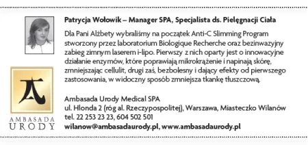 Elżbieta Lenska: It is much firmer, more moisturized. Of course, it was greatly helped by exercise and diet, but the proper transformation was achieved through treatments at the Ambasada Urody beauty salon. Today, I know how a professional approach to skincare can transform the body. During my last visit with the wonderful ladies at Ambasada, we reminisced about how bad I looked before starting the program, and how good I look today. I see it every day in the mirror. I am happy. And that's it.