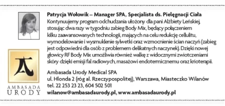 Alżbeta Lenska: Ambasada Urody is a wonderful place, and the ladies who take care of me are kind and professional. The effects of slimming treatments, including I-Lipo and Body Mix, are already visible - my skin has become much firmer and smoother. What I like about the whole therapy is that it is beneficial not only for aesthetic reasons but also for health reasons - it has draining properties, removes excess water from the body, making me slimmer and feeling lighter.
